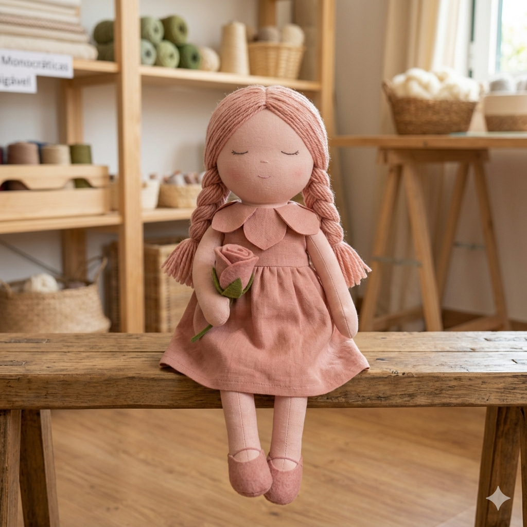 A Boneca Pétala é a representação física do carinho. Com sua paleta monocromática em tons de Rosa Antigo e Pêssego, ela foi desenhada para transmitir uma sensação de acolhimento imediato, funcionando como um suporte emocional através das cores e texturas.